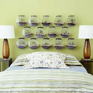 用塑料小鱼缸组合成的超创意床头。这无疑是喜爱户外嬉戏的孩子们的最爱。鱼缸里可以摆放喜爱的水藻或植物,摆放出各种造型。
