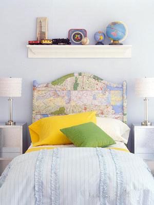 如果你的孩子是个天生的旅游爱好者,那么把他的床头设计成四海的地图无疑是再好不过了。床头上的置物架上还可以摆放小地球仪。装饰用的地图最好是选用防水材质的,经久耐用而且易于清洁。