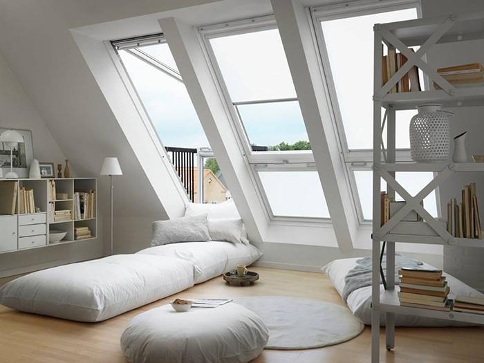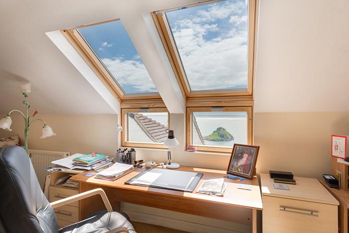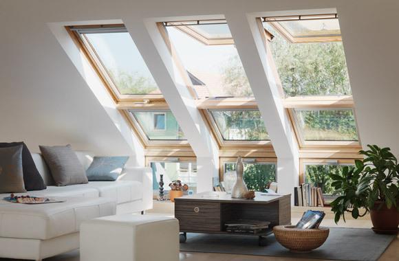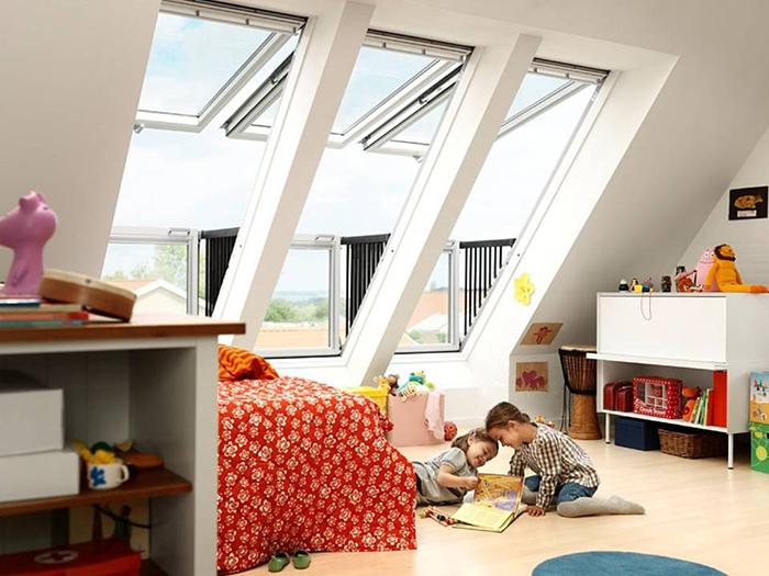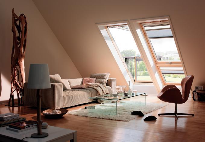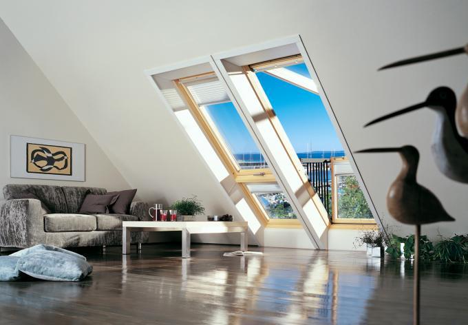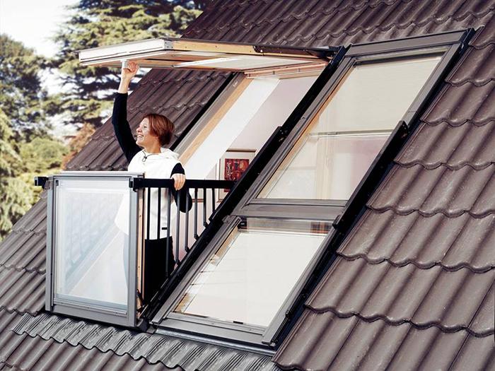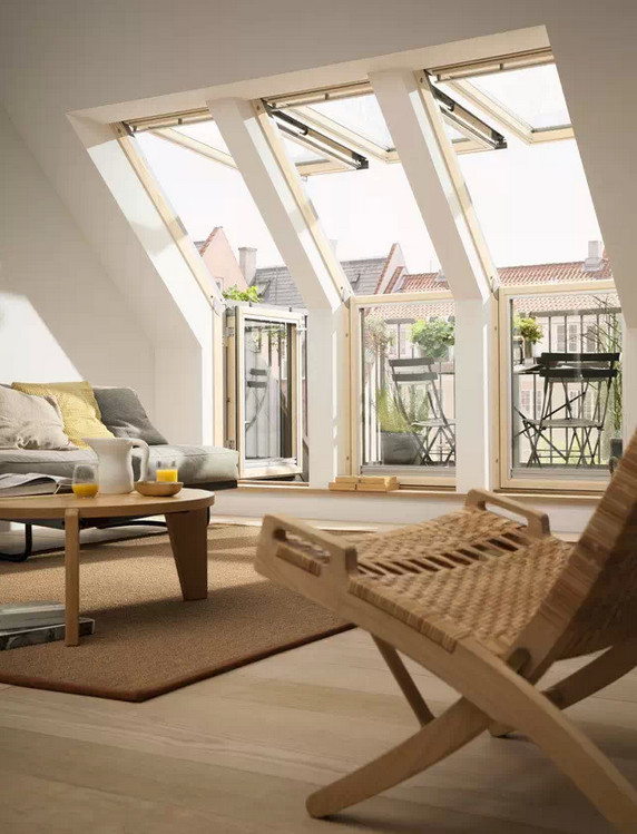 阳台窗常应用于别墅设计及高档酒店,由上下两部分组成,上面部分最大开启角度为45°,下部分窗可推开至90°,窗体适合安装在坡度为35°~53°之间的屋面上。可以单独使用,也可多组拼合在一起。