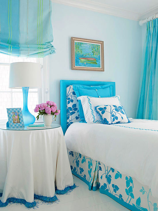 同色系的房间,用对比色系的软装装饰来点缀,蓝色的空间那一束温柔的浅粉花朵,不知不觉中为整个空间增添了些许的柔情蜜意。