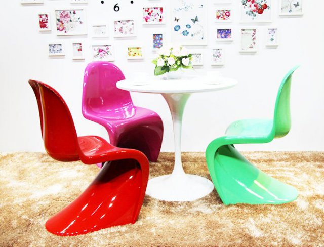 潘顿椅 ( Panton Chair ) ,也被称为鸭舌椅,是由丹麦的设计师 Verner Panton(维奈 · 潘顿)设计 1968 年设计的。潘顿椅的外形独特,形如经典的 "S" 又像灵活的 "5",潘顿椅是一次模压成型,具有强烈的雕塑感,色彩也十分艳丽,至今仍享有盛誉,被世界许多博物馆收藏。潘顿椅使用玻璃钢材料,表面处理得光滑平整,达到反光境面效果。椅子背面与正表面一样光亮,两边缘对称、均匀。
