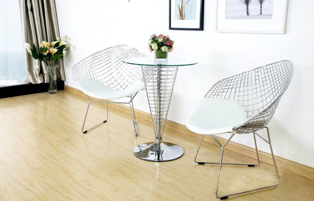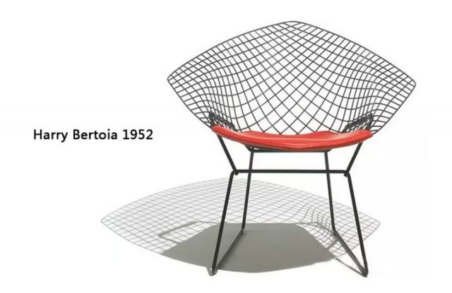 美国设计师 Harry Bertoia(哈里 . 伯拖埃)的 " 钻石椅 " 当属于这样经典的作品了。这把纯粹用金属焊接而成的椅子,如果要形容,就是一张铁网兜,铁网,或者说金属网,英语叫做 "mesh",下面焊接上两个金属的脚,就是椅子了。这铁网或者抛光,或者电镀,闪闪发光,外形似钻石状,因而得名。因为设计奇特,仅仅是简单的铁网而已,这椅子不会被磨花、腐蚀,用好多年看起来都是一样的,这点很特别,钻石椅基本不会变旧。