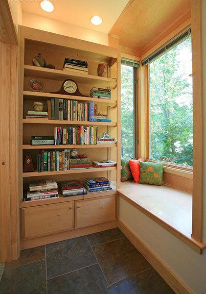 天然的角落飘窗,旁边是一个书架,上面整齐的摆放着各种各样的书籍,形成了一个天然的书房,原木色更清新。