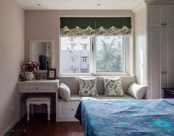 白色的柜子搭配蓝色的青花床垫,形成了一个天然的休息场所,角角落落的边柜,装饰品,让飘窗增加了新功能。