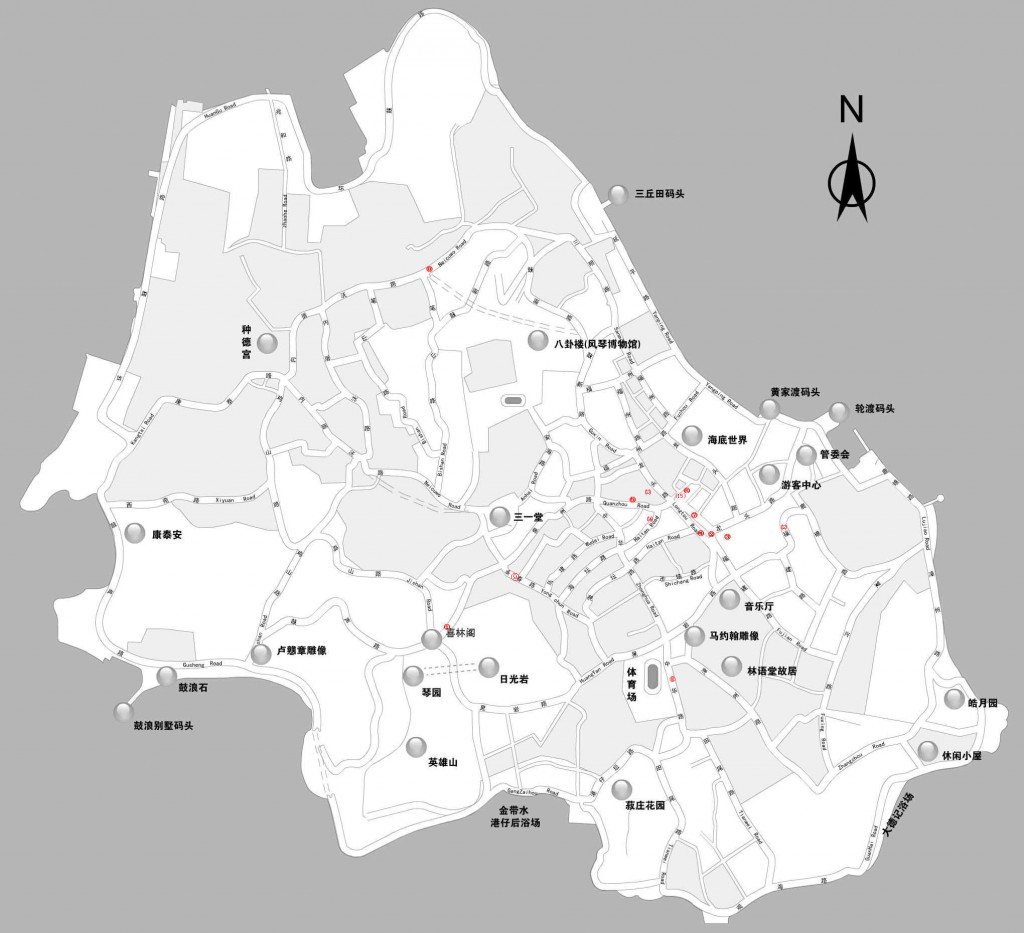 厦门鼓浪屿地图:上地图之前先解释一下鼓浪屿的地形。如果我们将鼓浪屿看成一个时钟,时针上的数字对应1-12 共12个数。则有以下情况: