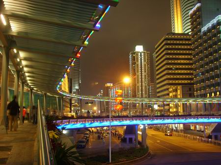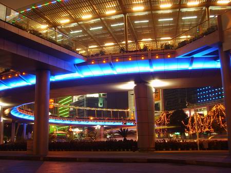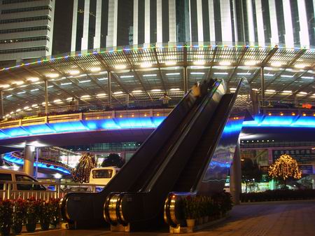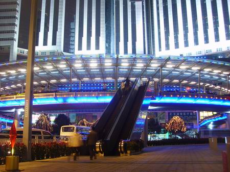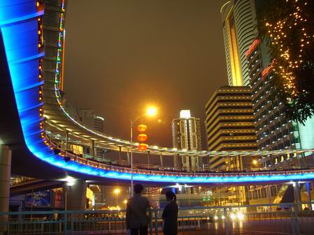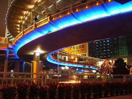 在深圳繁华商圈内的这座人行天桥,体积庞大,装饰奢华,人行天桥横跨深圳两条最繁华的商业街深南大道和人民南路,弧形的天桥有流畅动感的线条,璀璨的灯光装饰,配有双向自动扶梯,无论从远处眺望,还是近处细看,都与周围夜色迷离的都市夜景融为一体,成为这座充满动感与活力的都市里一道气派独特的风景。
