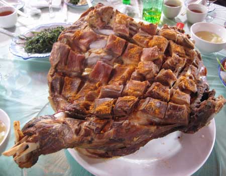 制作方法:将羔羊后腿洗净后加辅料腌制一段时间(胡萝卜最好是榨成汁,这样腌制时羔羊腿可以充分的吸收胡萝卜素,使其颜色和味感更佳),等充分入味后再进行后烹制。再配上经过特殊调制的调味料拼盘即可。