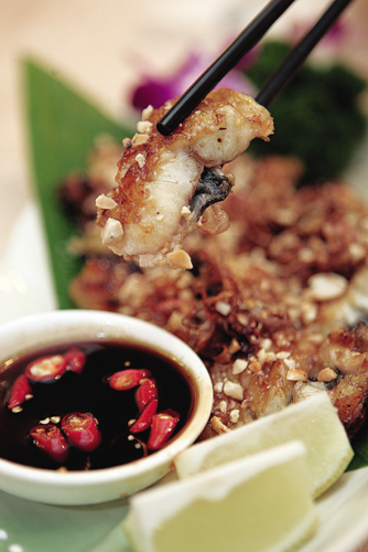 蚝的做法有许多,不敢生吃的朋友可以试一下炸蚝。除去外壳的生蚝外面蘸了面粉炸得焦脆,一咬就从里面喷出鲜美的汁水,令人赞叹。除了生蚝和鱼生这两种招牌菜,这边的其他菜式味道也不错。“蚝水浸鸡”鲜甜嫩滑,用蚝水吊出鸡味,做法比较少见,值得一试。