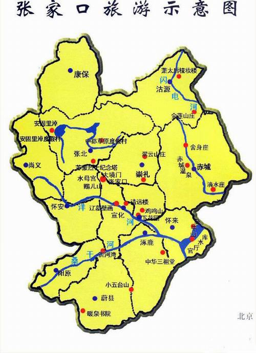 张家口市的古遗址数量很多,分布面广。古长城的“大镜门”是长城要隘,也是张家口市的象征。涿鹿县矾山是“黄帝战蚩尢”的古战场,是中华民族的发祥地之一,每年都有众多的炎黄子孙来这里寻根祭祖。此外,还有蔚县代王城汉墓群、怀安县汉墓群、宣化辽壁画墓以及市区的水母宫、云泉寺、清远楼等,都是颇值得一观的古迹。位于张北中都的中都草原是距北京较近的自然草原,夏季气候凉爽,草场繁茂,来此还可以体验蒙古族风情,是消暑休闲的胜地。