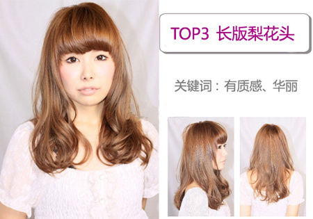 小编点评:这个秋冬以发尾做一圈华丽的大卷为特色的梨花头继续流行,比起以前的中长梨花头,这款充满质感、温柔可爱的长版梨花头更受到宠爱。刘海的发丝光泽柔顺,吹成内弯,厚重且整齐,与动感的发尾形成鲜明对比。搭配金棕色的发色,既显青春有活力,又有一种华丽的感觉。