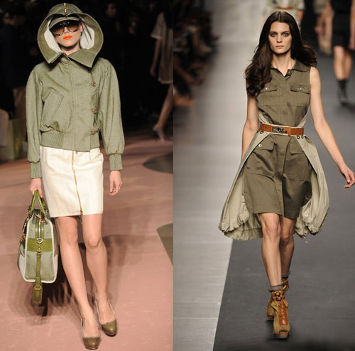 2010年春夏在荷叶边等充满女性味道的浪漫裙装为主趋势前提下,仍不乏出现颇为帅气的军装元素。更新的机车夹克、机车短裤、双排扣外套等,都带着中性帅气的军绿色、卡其色出现在人们的视线中。灰或棕的色调中配合深浅各一的卡其色,形成浅军绿和军绿色,对本季的军装风格非常适用。同时一些鲜亮的色彩,如薄荷绿、豌豆绿等,不仅为服装带来了精致感,也增添了一份明亮的惊喜。