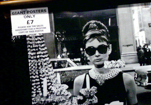 此图传递了两个信息:第一,Tiffany多么闪耀,隔着墨镜都能看清楚;第二,当年很流行Ray-Ban的Wayfarer,两品牌不妨惺惺相惜以后搞个合作纪念款,“向奥黛丽赫本致意”也蛮美妙;第三,奥黛丽赫本的脸是名副其实巴掌大小,竟然能罩住大半个脸,了不起!