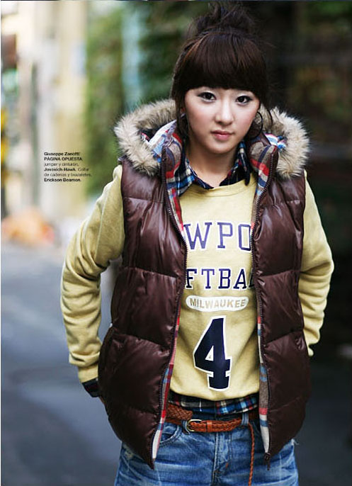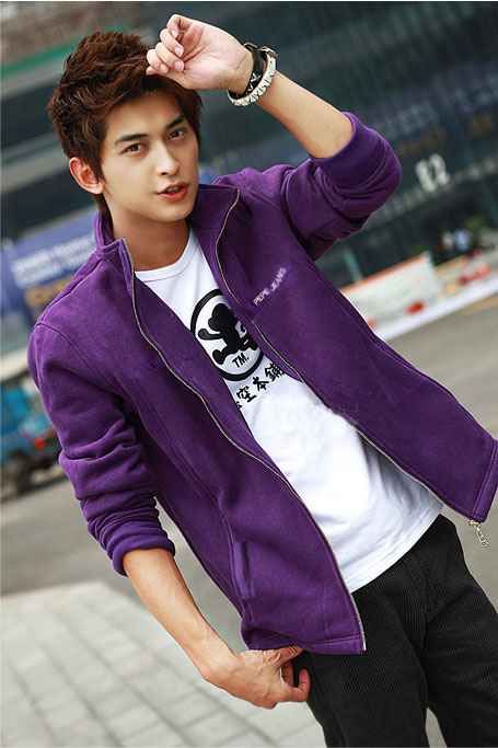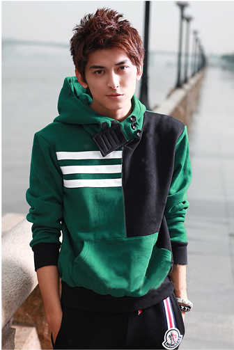 如图左侧,当印花卫衣单穿的时候整体是一种街头运动,或者说是有一点大男孩的感觉。但是当卫衣,由其是兜帽卫衣和韩版单扣合体西装单配的时候,这种雅皮的感觉由然而生,虽然图中的牛仔裤的搭配使得整体还是比较街头,但是和单穿套头卫衣相比已经完全变了一种感觉。有些款式就是受到这种搭配的启发,干脆开发了一种卫衣和西装结合的假两件套外套