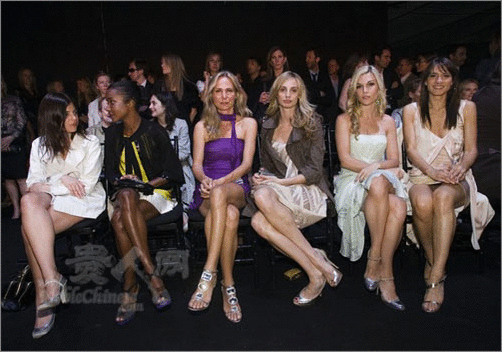白色礼服:Bee Shaffer与母亲出现在07春夏Proenza Schouler秀场的1身白色刺绣吊带裙,显得很舒适,但烦闷有余;而Julia Rstoin Roitfeld在Peter Som08春夏秀场上穿着Topshop白色单肩礼服俏皮可爱。