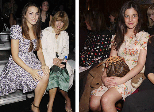 小碎花:Bee Shaffer与母亲加入08春夏Marc Jacobs秀时,选择了1身非常少女款的高腰线蓬蓬袖的散摆碎花连衣裙,只能让人说很美国乡村很大妈;而Julia Rstoin Roitfeld在05秋冬Luella秀场出现时,穿了很贴合Luella品牌品格的1件碎花连衣裙,同样是田园气味的少女款连衣裙,却10足的法国女孩儿味,身上散发着阳光和葡萄园的芳香