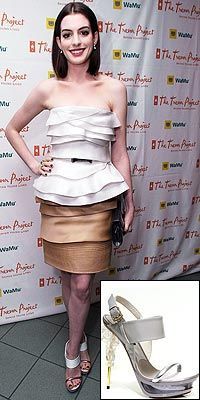 明星Anne Hathaway将Gianfranco Ferre的水晶高跟鞋搭配身上穿的意大利设计风格的无肩带荷叶边上衣和裙子,与此同时也为自己大做广告!