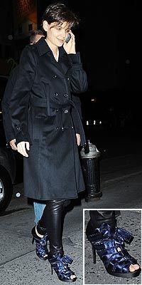 百老汇明星Katie Holmes穿上她的Bruno Frisoni深藏青色系带短靴出席表演。