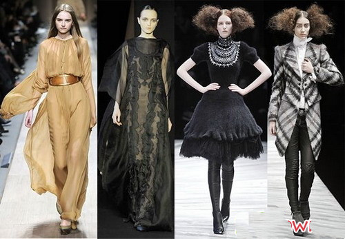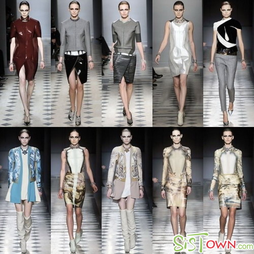 多样的金属色——金色,银色,亮橙色,电蓝色——遍布T台,光泽不再沉重,而是更加的轻盈,有液体的质感。设计师将闪亮结合怪异的廓形,诸如Alexander McQueen镶满水晶的雕塑轮廓短裙,以及Karl Lagerfeld冰灰色的褶皱铅笔裙。