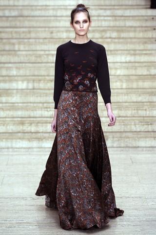 如果觉得长半裙搭配针织衫太保守,可以参考Pucci。Peter Dundas打造的长连衣裙背部有低开设计,展示身体之美。还可以体验路易威登的女人味轮廓:蕾丝衬衣非常适合派对,搭配中长皮裙,十分完美。