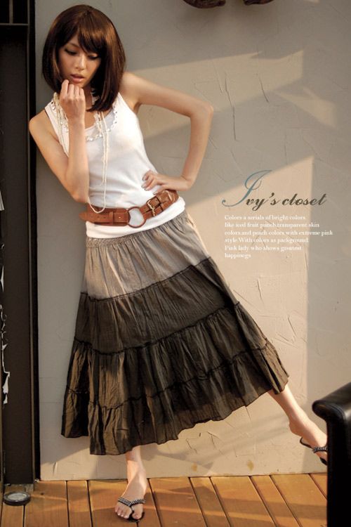 时尚点评:灰色与白色的渐变洋溢着优雅气质的感觉,素净的白色背心上衣搭配长裙充满休闲、浪漫的情怀!