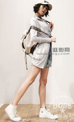 利落的卷边牛仔短裤活动方便也显双腿修长,拉链卫衣实用又很有流行风范。