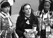 姐妹淘的穿着相互之间都非常呼应,而且紧追潮流。她们的头箍证实了这点。左边华裔女孩Katy的这件外套来自ZARA。繁复的条纹本身已经很抢眼,使用条纹中配色最少最明亮的白色作为配饰的颜色,既突出,又不会掩盖外套的风采。中间穿着维多利亚风格的是Blair,小蝴蝶结衬得她很有古典美。右边的Isabel,黑白格外套衬以鹅黄色大手袋,都市感十足。