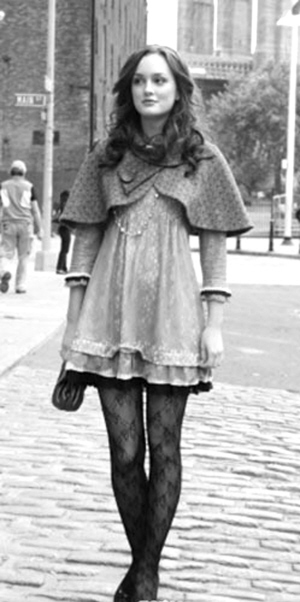 Blair依然是扮淑女,感恩节那天,Blair心事重重地在大街上闲逛。尽管她不知道要感谢谁,但至少还有这身足以吸引回头率的时尚装扮让她感激。轻纱连衣裙配小斗篷,显得俏皮可爱,腿上一双黑色花纹丝袜,又增添了几分神秘色彩。