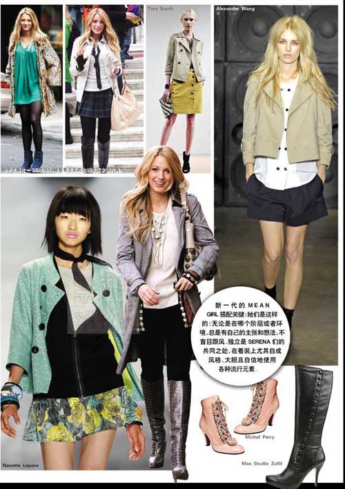 而在我们看来,新一代的mean girl更像是Kate Moss与Sienna Miller的混合体,跟美国女孩不同,她比较接近欧洲的自由风范,像她去参加上城东区的生日会或派对,都不会选择复杂的设计。在她的时尚品位里,不会盲目追随传统大牌,反而会更关注一些年轻、有活力的新兴设计师的东西,比如Alexander Wang或者Vena Cava,但是她绝对明白如何结合大牌来散发魅力,因此,混搭、带点摇滚范儿,又有点流行时尚文化,就是她的特质了。比如她广为传颂的第一集回归造型,则相当明确地体现了这一点,cheap Monday仔裤、Petit Bateau条纹圆领衫外搭古董外套,背的是Coach包,手里则拎着LV古董箱,在配件上则使用了Ralph Lauren的丝巾和皮带。