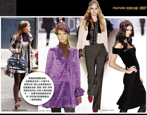 最Blair的造型通常是一件vintage风格如Oscar de la Renta的长罩衫,一条Wolford的紧身裙,Philip Lim设计的发带,颜色或花纹抢镜的Stretsis长袜,再加上珍珠项链