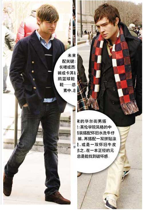Eric拿J.Press打造了上城东区男生的风貌,将保守风格的领带松开一点,便可以展现出Nate的白马王子型。纨绔子弟Chuck是不折不扣的坏男孩,骄傲而张扬,要体现出这一点,尽管男性服装的颜色很难出跳,但领结、围巾和鞋子却可以帮大忙。这些配件都是为个性加分的东西。Chuck夏天用丝质围巾,冬天用羊毛围巾作为他的形象标志,还有颜色鲜亮的领结,以及条纹格运动鞋,与变化不大的校服或西装搭配,这种复古与前卫混搭的激进路线,把坏男孩特质烘托得淋漓尽致。而“穷小子”Dan则主要以同色系低调和谐的搭配以示跟其他贵族子弟的区别,类似古着的大翻领双排扣中褛、条格夹克、围巾,再加同色系鹿皮皮鞋。