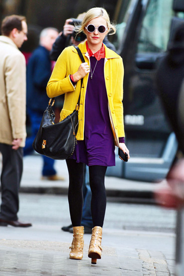 橘色和紫色的拼色穿法很可爱,可以看出明黄色的外套是为了和紫色连衣裙产生撞色的效果,只不过外套的面料过于软塌塌,以至于没有任何层次感可言。