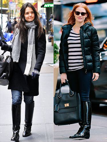 最酷的靴子就是光亮的毫无装饰的及膝长靴,把你的裤腿塞进去,打造女王or侠女风范吧!