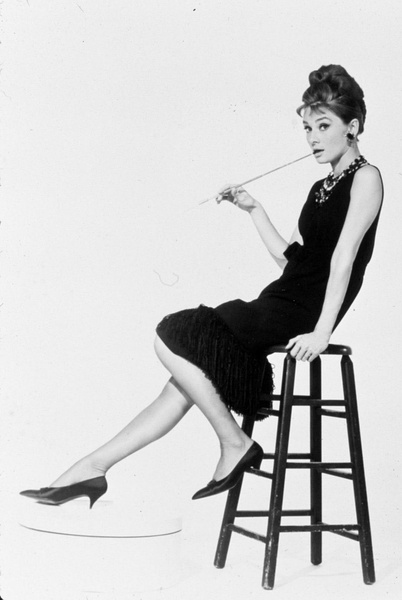 这个场景出自于奥黛丽·赫本1961年的影片《蒂凡尼的早餐》,优雅的盘头,巨大的黑色太阳眼镜,无不衬托了赫本的高贵。而她身着的那条黑色鸡尾酒裙也成了奥黛丽·赫本经典的象征。