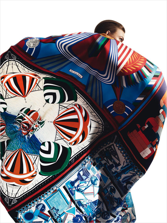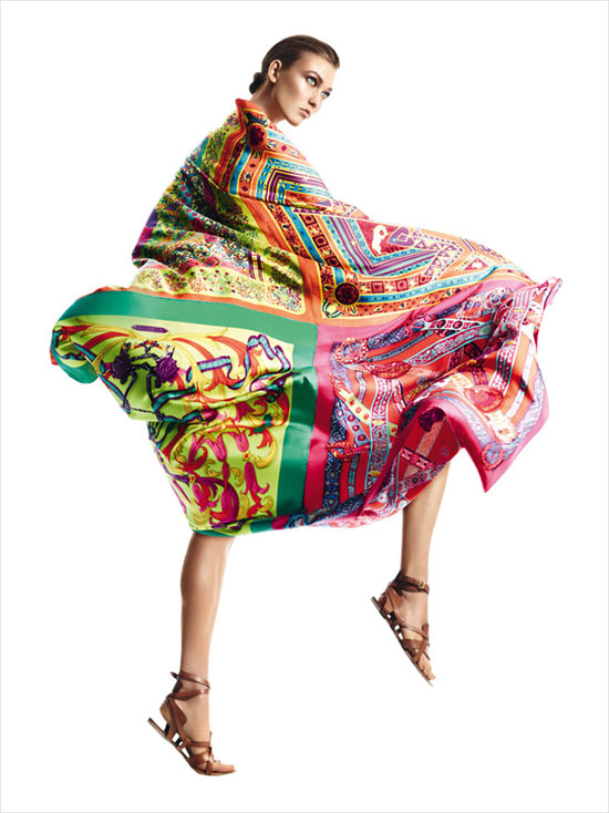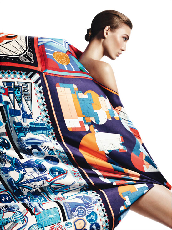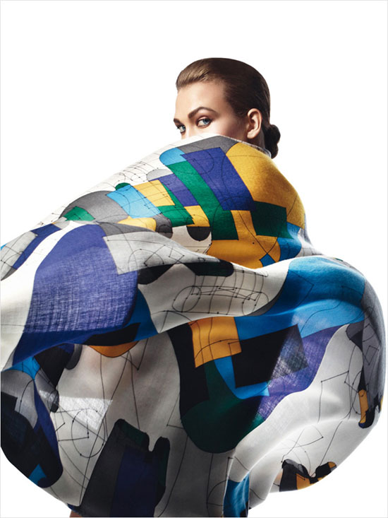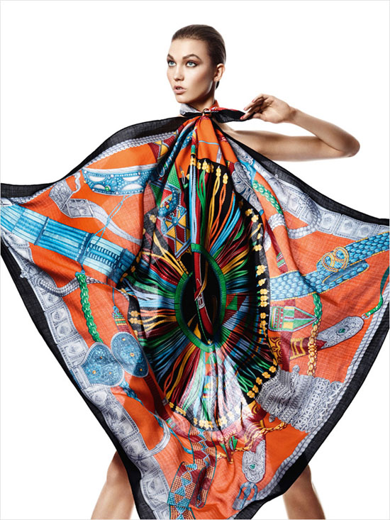 顶级超模 Karlie Kloss(卡莉.克劳斯)身披 Hermès(爱马仕)各色丝巾登上《Harper"s Bazaar》西班牙版2013年4月刊,与时尚摄影师 David Sims 携手打造「Aves de Paso」摄影专辑。