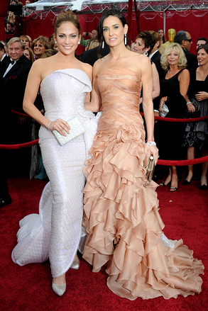 珍妮弗•洛佩兹(Jennifer Lopez)与身穿乌干纱质地范思哲高定(Atelier Versace)礼服的黛米•摩尔(Demi Moore)合影。