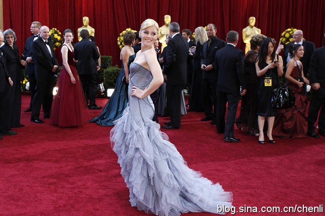 以《在云端》获得最佳女配角提名的维拉 - 法米加(Vera Farmiga)身穿Marchesa长裙。