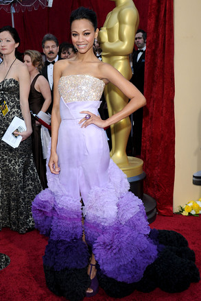《阿凡达》佐伊 - 索尔达娜(Zoe Saldana)的Givenchy礼服,紧身亮色上衣不如渐变色长裙下摆抢眼。