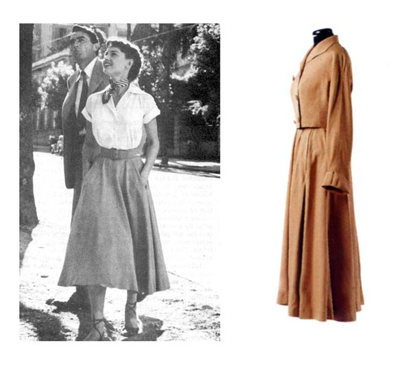 1952年,赫本被著名导演威廉·惠勒慧眼发掘,主演了她的第一部电影《罗马假日》,也是后来给她带来巨大成功声望的经典之作——因为《罗马假日》赫本赢得了她一生中唯一的奥斯卡最佳女演员奖。大家一定对剧中安妮公主游览罗马城时所穿的白衬衫和大摆裙的印象最为深刻,赫本所穿的大摆裙其实是一套由双排扣的短夹克和斜裁圆摆裙(上衣为3粒纽扣双排扣,府绸面料,奶油色丝质内衬,由派拉蒙档案馆收藏)组成的套装,在电影中,公主只穿了裙子配白衬衫,所以在一些《罗马假日》的海报中,公主的裙子被上色成蓝色,其实是错误的,公主的裙子实际上是棕色的。