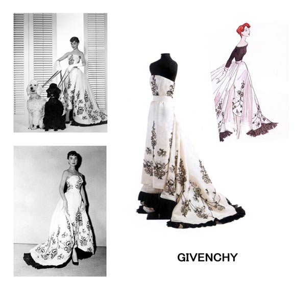 1953年夏天对赫本来说是一个重要的日子--她遇见了修伯特·纪梵希。赫本来到巴黎为她即将主演的第二部电影《龙凤配》挑选戏服,她选择的设计师是纪梵希。赫本早在两年前就在关注纪梵希的设计了,在拍摄完《蒙特卡罗的宝贝》后,赫本就用影片的薪酬购买了一套纪梵希的女装。可是此时的纪梵希正在为两周后的春夏展忙的不可开交,根本抽不开身为赫本的电影设计戏服,只能让她在已有的成衣中挑选几套作为戏服。赫本共挑选了3套戏服,其中一件就是著名的黑白大花裙。这是纪梵希53年春夏展中的一件白色、紧身、无肩带连身长礼服裙,上衣、裙身及裙摆上都绣者黑色丝绒的花朵,美的令人窒息,即突显了赫本纤细的身材和优雅的气质,也赋予了这件长裙别样的风采。这是一件由绣着黑色丝绒花朵和白色串珠的白色蝉翼纱制成的18世纪样式的两件套式长裙——无肩带低胸鲸骨紧身上衣,直身长裙外加一件可卸式椭圆型裙摆上带有黑色蝉翼纱褶边的拖尾长裙,丝质内衬。有个罕为人知的细节是:在这件编号为808的晚礼服设计的草稿原图上,上半部分是一件黑色圆领的七分袖上衣。