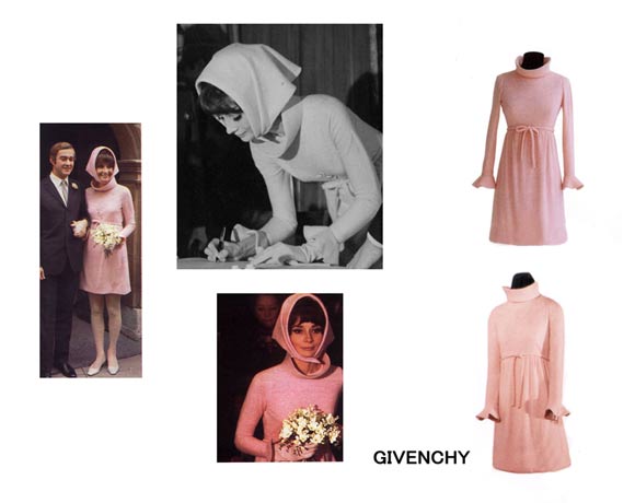 1967年的《等到天黑》上映后,赫本便完全息影,直到9年后才复出与肖恩康纳利主演了影片《罗宾汉和玛丽安》。1968年赫本与梅尔正式离婚,次年与意大利贵族学者(心理医生)多蒂结婚。赫本的第二次结婚礼服是由纪梵希设计的一套粉色连衣裙和长外套的套装:一件粉色斜纹羊毛面料的及膝双排扣无领高腰外套,另一件是粉色马海毛和羊绒的高领针织连衣裙,宽褶边的紧身长袖,由细腰带打成的结装饰腰部,使赫本看上去年轻了不少。