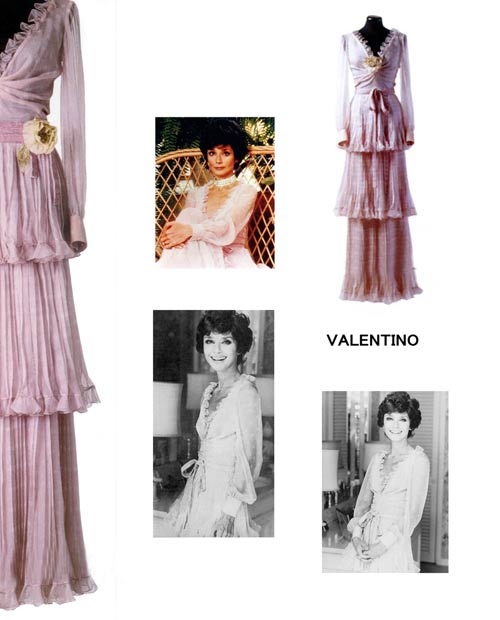 1973年瓦伦蒂诺的春夏季长袖晚礼服,面料是淡紫色底象牙色圆点的雪纺绸,上身深V字领口装饰有花朵,裙身是泡泡纱制的三层带小褶边的荷叶边,腰间缠绕两圈天鹅绒的腰带。