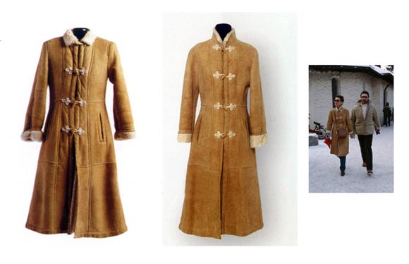 1980年购置的一件毛皮一体的立领长大衣,木制的牛角型扣。赫本晚年在瑞士生活的时候常穿这件厚外套,在寒冷的瑞士足以过冬了。