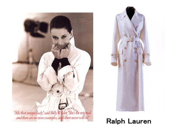 1990年购置的拉夫劳伦白色亚麻及踝长度的长风衣。赫本在瑞士生活的晚年期间,经常穿着拉夫劳伦的衣服参加日间的交际应酬,她和拉夫劳伦本人也是很好的朋友。