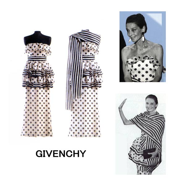 1988年赫本与派克一起出席奥斯卡的颁奖典礼的黑白圆点图案的丝锻长礼服,由纪梵希设计,上衣领口饰有褶边,裙身饰有条纹和圆点交替的荷叶边,附带一条条纹丝缎披肩。