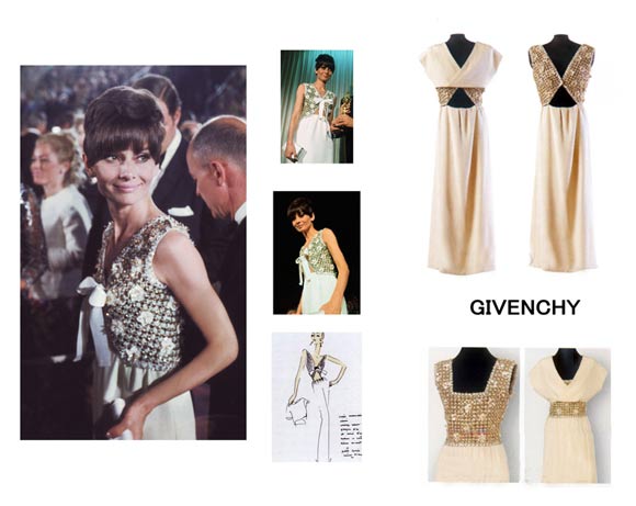 1968年4月10日加州圣莫尼卡奥斯卡颁奖现场,这是赫本息影之前的最后一次出现在奥斯卡颁奖现场,她既作为最佳女主角提名者(因《等到天黑》获提名),又作为最佳男主角奖的颁奖嘉宾出席。赫本身穿的是一件纪梵希设计的象牙色绉丝礼服,绣满了金、银、白、绿四色亮片的高腰短上衣上点缀着金色和白色亮片的丝绸五瓣花,宽肩带方领,另加一件无袖的不对称裁剪上衣外套。