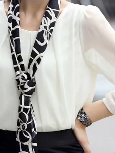 小小一片方巾,轻轻围绕在脖子上,系成蝴蝶结,或者懒散的做出折叠领的效果,成为很好的服装延伸装饰部分。在无领针织衫的组合上,表现特别出彩!