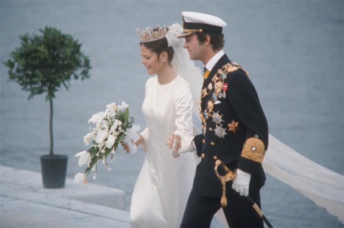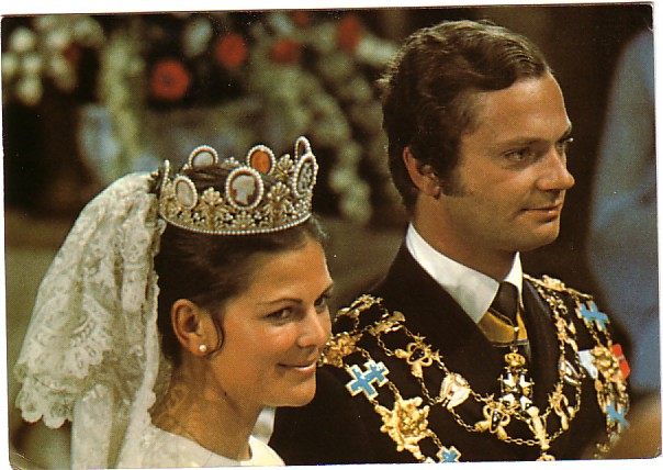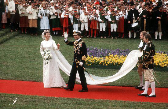 - 1976年6月19日,斯德哥尔摩主教堂举行了盛大的婚礼,30岁的瑞典国王卡尔·古斯塔夫——那位知名的拿破仑麾下的将领让·巴蒂斯特·贝纳多特,1818年贝纳多特王朝的开创者的后人——迎娶一位年轻的侍女,西尔维娅·索莫拉特。这位黑发的德国混血儿比他年长三岁,与王子相识在1972年的慕尼黑奥运会期间。1973年9月15日,卡尔·古斯塔夫成为瑞典国王卡尔十六世·古斯塔夫。不过去年年底时,一本书爆出了这位国王的许多丑闻,让瑞典王室形象受到重创。