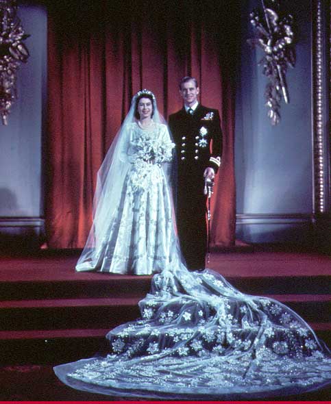 - 1947年11月20日,伊丽莎白·温莎,21岁的英国公主,英王乔治六世的女儿,在伦敦威斯敏斯特大教堂嫁给了大她四岁的菲利普·蒙巴顿。他是希腊与丹麦王子出身,跟伊丽莎白一样同是维多利亚女王的玄孙。他们已经相识多年,婚后菲利普受封爱丁堡公爵。伊丽莎白将在1953年6月2日登基继承英国王位,成为伊丽莎白二世,现今的英女王。2007年,已经80高龄的伊丽莎白女王与菲利普亲王已携手走过60年,她也成为英国第一个庆祝钻石婚的在位君主。