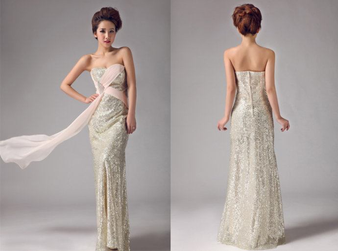 还有一种最常见的礼服就是抹胸式晚礼服了,一般来说,抹胸式晚礼服也是露背装,性感指数很高,但是这种抹胸式礼服有一个问题,那就是胸小的女孩可能撑不起来,同时由于露背的缘故,存在着走光的危险,因此穿这种晚礼服的女孩一定要小心,做好保护措施以免遭遇尴尬。最好选择后背暗藏绑带的款式,可以调节一下胸围。