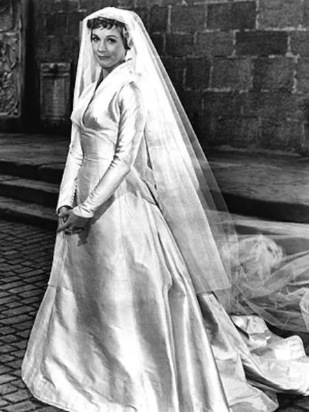 1964年,电影《The Sounds ofMusic》里Maria将与上校Von Trapp在奥地利的萨尔茨堡大教堂结婚时,身着这身高领、场秀的极简婚纱,端庄而典雅。
